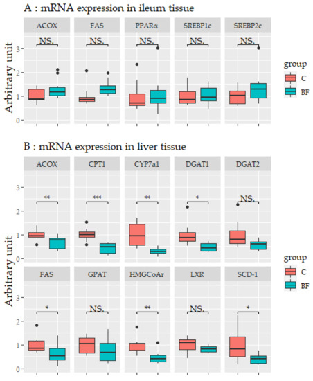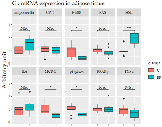 mRNA expression levels in the ileum, liver, and adipose tissues are shown in Figure 6. No significant differences in mRNA expression levels were observed in the ileum (Figure 6A). In liver, the mRNA expression levels of fatty acid synthase (FAS), acyl-CoA oxidase (ACOX), diacylglycerol o-acyltransferase-1 (DGAT1), stearoyl-CoA-desaturase-1 (SCD-1), carnitine palmitoyltransferase-1 (CPT-1), 3-hydroxy-3-methyl-glutaryl-coenzyme A reductase (HMG-CoA r), and cytochrome P450 7A1 (CYP7a1) were significantly lower in the BF group compared with the control group (p < 0.05) (Figure 6B). In adipose tissue, the mRNA expression levels of hormone-sensitive lipase (HSL) was higher in the BF group compared with the control group (p < 0.05), and the mRNA expression of monocyte chemotactic protein 1 (MCP-1), F4/80, and NADPH oxidase subunit p67 phox (p67phox) were significantly lower in the BF group compared with the control group (p < 0.05) (Figure 6C).