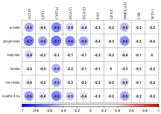 Spearman’s rank correlation analysis between SCFAs and expression of mRNA related to lipid metabolism in the liver. The values in the figure shows the correlation coeffcient. Blue circles show negative correlation and red circles show positive correlation. ACOX, Acyl-CoA oxidase; CPT1, Carnitine palmitoyl Table 1. CYP7a1, Cholesterol 7alpha-hydroxylase 1; DGAT1, Diacylglycerol acyltransferase-1; DGAT2, Diacylglycerol acyltransferase-2; FAS, Fatty acid synthase; GPAT, glycerol-3-phosphate acyltransferase; HMGCoAr, Hydroxymethylglutaryl-CoA reductase, reductase; LXR, Liver X receptor; SCD-1, Stearoyl-CoA desaturase 1; total SCFAs, total short-chain fatty acids.
