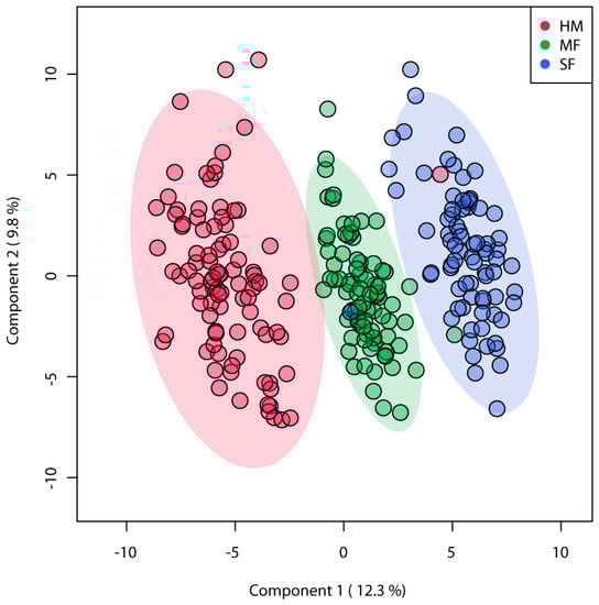 Partial square discriminant analysis (PLS-DA) model from urinary metabolites of 3 months infants fed human milk (HM), cow’s milk-based infant formula (MF), or soy protein-based infant formula (SF). PLS-DA scores (i.e., individual samples) for PLS-DA components 1 and 2 are displayed. Shaded areas represent the 95% confidence regions. Red circles indicate HM (n = 93), green circles indicate MF (n = 80), and blue circles indicate SF (n = 76).