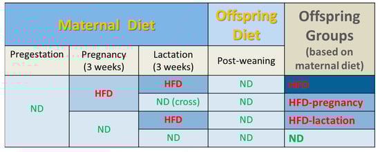 - Treesukosol, Y.; Sun, B.; Moghadam, A.A.; Liang, N.C.; Tamashiro, K.L.; Moran, T.H. Maternal High-Fat Diet during Pregnancy and Lactation Reduces the Appetitive Behavioral Component in Female Offspring Tested in a Brief-Access Taste Procedure. Am. J. Physiol. Regul. Integr. Comp. Physiol. 2014, 306, R499–R509. [Google Scholar] [CrossRef][Green Version]