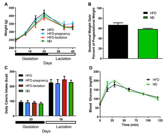 Maternal body weight was recorded on the day of mating (pregestational weight), on day 7, 14, and 20 of gestation and on day 14 and 21 of lactation (Figure 2A). No significant differences were noted across the groups in any of the examined time points; n = 3/group. Gestational weight gain was expressed as percentage of the pregestational weight of the mothers, there was no statistically significant difference observed between mothers kept on HFD or ND during pregnancy; 66.4% vs. 58.6%; p = 0.104; n = 6/group (Figure 2B). No differences were observed in maternal daily caloric intake measured on day 20 of the pregnancy and on day 16 of the lactation, n = 3/group (Figure 2C). Glucose tolerance tests were performed on day 14 of the pregnancy by careful intraperitoneal injections of glucose solution (1g/kg). Fasting glucose in the HFD dams was 70.5 ± 4.93 vs. 71.8 ± 3.39 mg/dL in the ND dams (p = 0.83, NS). Quantification of the glycemic excursions as AUC did not reveal statistical differences (16858 ± 1248.0 in HFD groups vs. 17351 ± 1165.3 in ND groups, p = 0.32, NS; Figure 2D).