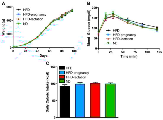 Offspring characteristics. Offspring body weight (A), glucose tolerance (B), average daily caloric intake (C). Group representations are the followings: black symbols and lines (A,B) or columns (C): HFD offspring (n = 9), black symbols and lines (A,B) or columns (C); HFD-pregnancy offspring (n = 9), light blue symbols and lines (A,B) or columns (C); HFD-lactation offspring (n = 7), red symbols and lines (A,B) or columns (C); ND group of offspring (n = 9), green symbols and lines (A,B) or columns (C). Data expressed as mean ± SEM. For more details and statistics, see Results.