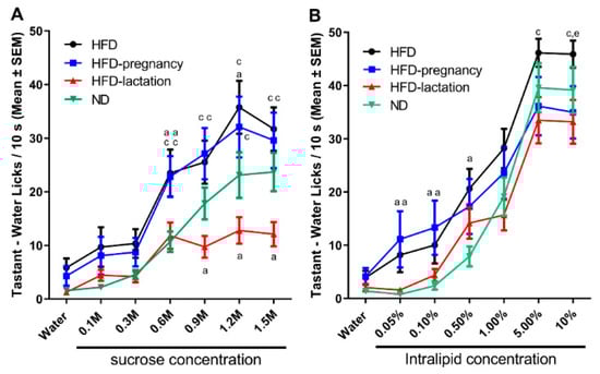 Short access taste responses to palatable sucrose and Intralipid solutions. Mean number of licks/10 s made for water and increasing concentrations of palatable solutions during taste testing at age of 10–11 weeks. Sucrose testing (A), and Intralipid testing (B). Group representations for both graphs: black lines and symbols: HFD offspring (n = 9); light blue lines and symbols: HFD-pregnancy offspring (n = 9); red lines and symbols: HFD-lactation offspring (n = 7); and green lines and symbols: ND group of offspring (n = 9). Statistical symbols represent post hoc comparisons between individual diet groups as follows: a p < 0.05 compared with ND; c p < 0.05 compared with HFD-lactation, e p < 0.05 comparing HFD with HFD-pregnancy. Data expressed as mean ±SEM. For more details and statistics, see Results.