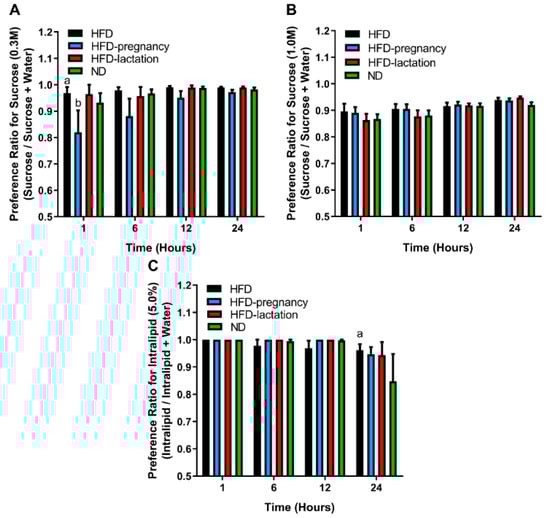Long access two-bottle preference tests. Two-bottle preference tests for 0.3 M (A) and 1.0 M (B) sucrose and 5.0% Intralipid (C). Group representations are as follows for all three graphs: black columns: HFD offspring (n = 9); light blue columns: HFD-pregnancy offspring (n = 9); red columns: HFD-lactation offspring (n = 7); and green columns: ND group of offspring (n = 9). Statistical symbols (a,b) represent post hoc comparisons between groups. In the case of 0.3 M sucrose (A) a p < 0.01 compared with HFD-pregnancy; b p < 0.05 compared with HFD-lactation. In the case of 5.0% Intralipid (C) a p < 0.01 compared with ND. Data expressed as mean ± SEM. For more details and statistics, see Results.