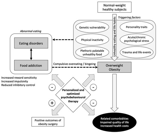 Food addiction as a causative or contributive factor for overweight and obesity. A personalized and optimized psychobehavioral therapy in patients with food addiction may help in preventing overweight and obesity, reducing their related comorbidities and related costs, and improving outcomes of obesity surgery. Dotted lines indicate connections for which published data are lacking or insufficient.