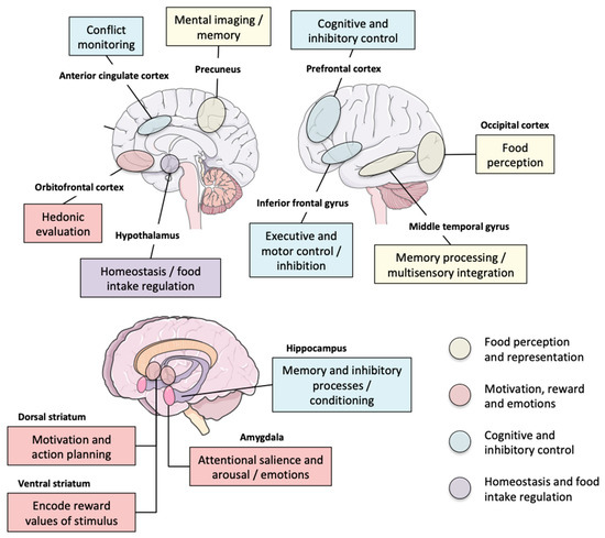 - Brooks, S.J.; Cedernaes, J.; Schioth, H.B. Increased prefrontal and parahippocampal activation with reduced dorsolateral prefrontal and insular cortex activation to food images in obesity: A meta-analysis of fMRI studies. PLoS ONE 2013, 8, e60393. [Google Scholar] [CrossRef]