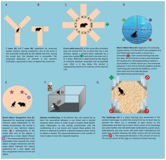 - Vorhees, C.V.; Williams, M.T. Assessing Spatial Learning and Memory in Rodents. ILAR J. 2014, 55, 310–332. [Google Scholar] [CrossRef] [PubMed]