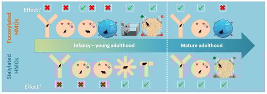 Supplementing mammals with additional HMOs leads to beneficial cognitive outcomes under certain specific circumstances (Table 1, Figure 2). In general, both fucosylated and sialylated HMOs contribute to an improved memory performance and faster learning speed (tests described in Figure 1A–G) when tested in mature adulthood, irrespective of the age of administration of these HMOs (e.g., during infancy or adulthood) [,,,,,,,,].
