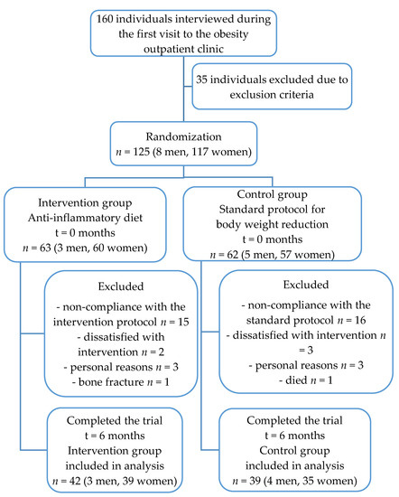 Dietary interventions for obesity management in randomized clinical trials are generally less effective compared to pharmacological interventions or surgery. It is difficult to highlight the effective nutrient(s) of an applied diet due to its complex and still not yet fully investigated metabolism, as well as methodological difficulties regarding standardizing a diet and fully monitoring what participants consume [82]. Choosing an inappropriate period to reveal a clinical effect could be a study limitation [78]. To overcome these limitations, the length of the present study was set to be 6 months, which is consistent with similar dietary intervention trials [20,37,65,71,77]. Significantly more women participated in our study, which also could represent a study limitation regarding data interpretation, as study results could more refer to the female gender rather than males. Participant recruitment was done in an obesity outpatient clinic where more women applied more and were also more willing to be involved in the trial compared to men. Low levels of participant compliance in nutrition trials decrease the power to detect effects on specified endpoints, result in false-negative findings, and ultimately mean that the study is unable to provide evidence to support a potentially beneficial effect of an intervention. Therefore, to maximize and assess compliance with dietary interventions, detailed dietary instructions, frequent contacts with a dietitian, and controlling food diaries according to the specified recommendations using two diet-monitoring methods were provided. This study was also strengthened by detailed assessments of dietary intake that were clarified by the dietitian and comprehensive outcome measures, including the DII®, which was not only confirmed as an effective tool for assessing the diet quality, but also for monitoring the change in diet toward a more anti-inflammatory diet.