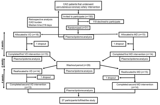 The strengths of the reported study include its cross-over design, well-characterized subjects receiving standard medical therapy, and a high rate of study completion. The applied untargeted lipidomics covered a wide range of lipid species, enabling us to investigate distinct impacts of diet intervention on different lipid species. Moreover, the present cross-over study design reduces the likelihood of bias and we estimated that any potential confounders (e.g., estimated glomerular filtration rate indicating renal function, diabetic status, statin or ezetimibe treatment) will be equally distributed in each sequence (MD-VD vs. VD-MD). Further strengths are comprehensive statistical analyses, including both traditional and machine learning methods including multivariate statistics (supervised multilevel random forest, WGCNA network analysis, and unsupervised principal component analysis) and univariate analysis, allowing identification of lipid clusters associated with diet intervention, cardiometabolic risk factors, and CAD burden. Of note, by using multilevel modelling particular designed to analyze dependent data structures in which different treatments are administered to the same subjects, we could successfully exploit within-individual variation in lipidome related to dietary intervention.