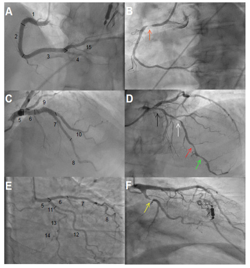 Coronary angiograms. (A,C,E) show 15 segments of the coronary tree classified according to the American Heart Association without significant obstructive coronary artery disease. (A): 1 = Proximal right coronary artery, 2 = middle right coronary artery, 3 = distal right coronary artery, 4 = right posterior descending artery, and 15 = left posterior descending artery; (C): 5 = left main coronary artery, 6 = proximal left anterior descending artery, 7 = middle left anterior descending artery, 8 = distal left anterior descending artery, 9–10 = first and diagonal branches of left anterior descending artery; (E): 11 = proximal left circumflex, 12 = obtuse marginal branch, 13 = distal left circumflex, 14 = posterolateral branch. (B): significant obstructive coronary artery disease with stenosis ~90% (orange arrow) in segment 1; the longitudinal extent of atherosclerosis was ~70%. (D): Arrows from right to left show ~40% (black), ~60% (white), ~60% (red), and ~40% (green) stenosis in segments 6, 7, 8, and 8, respectively. Longitudinal extent of atherosclerosis was ~80% in segment 6, ~90% in segment 7, and ~80% in segment 8. (F): ~90% stenosis in segment 11 (yellow arrow) with estimated ~50% longitudinal atherosclerosis.