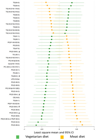 The effect of diet on plasma lipid profiles. Plasma lipids significantly differed between the vegetarian and meat diet by generalized linear mixed modelling (FDR p < 0.05). Standardized values of least-squares mean with 95% confidence intervals are presented for comparison. TG, triacylglycerols; DAG, diacylglyceride; PC, phosphatidylcholine; PG, phosphatidylglycerol; PI, phosphatidylinositol; PE, phosphatidylethanolamine; O-PC, alkylphosphatidylcholines; LPC, lyso-phosphatidylcholine; SM, sphingomyelin; Cer, ceramides; CE, cholesteryl ester. # Lipids with same fatty acyl chains (Cx:y) were presented in the dataset, where x represents the number of carbon atoms and y the number of double bonds of the fatty acyl chain.