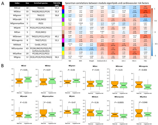 Co-expression modules of lipids determined by the weighted gene correlation network analysis. Module size, lipid species, and range of total number of carbons (CN) and number of double bonds (DBC) of TG (A, right), Spearman’s correlation coefficient between modules and cardiovascular risk factors (A, left), and difference in eigenlipid of modules between VD and MD (B). Cer, ceramide; CE, cholesteryl ester; DAG, diacylglyceride; HDL-C, High-density lipoprotein cholesterol; HexCer, hexosylceramide; LacCer, lactosylceramide; LDL-C, low-density lipoprotein cholesterol; LPC, lyso-phosphatidylcholine; O-PC, alkylphosphatidylcholines; PC, phosphatidylcholine; PE, phosphatidylethanolamine; PG, phosphatidylglycerol, PI, phosphatidylinositol; SM, sphingomyelin; TG, triglyceride.