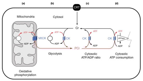 “The creatine kinase (CK)/phosphocreatine (PCr) system. Isoenzymes of CK (blue) are found in different compartments such as mitochondria (octameric MtCK, (a)) and cytosol (dimeric CK, (b)–(d)) in soluble form (c) or associated to a different degree to ATP-delivering ((a) and (b)) or -consuming processes (d). A large cytosolic PCr pool up to 30 mM is built up by CK using ATP from oxidative phosphorylation like in heart (a) or glycolysis like in fast-twitch glycolytic muscle (b). PCr is then used to buffer global (c) and local (d) ATP/ADP ratios. In cells that are polarized and/or have very high or localized ATP consumption, these CK isoenzymes, together with easily diffusible PCr, also maintain an energy shuttle between ATP-providing or -consuming processes ((a) and (d)). Metabolite channeling occurs where CK is associated with ATP-providing or -consuming transporters, pumps, or enzymes ((a), (b), and (d)). Creatine (Cr) is synthesized in only few cell types (e.g., liver and kidney) and has to be taken up from the blood stream by a specific Cr transporter (CRT) that is highly expressed by Cr-containing target cells.” Figure and legend reprinted from [] Encyclopedia of Biological Chemistry, Vol 2, Schlattner, U., Tokarska-Schlattner, M., and Wallimann, T. Metabolite channeling: creatine kinase micro compartments, 80–85, Copyright (2013), with permission from Elsevier Publishing Company. http://www.elsevier.com.