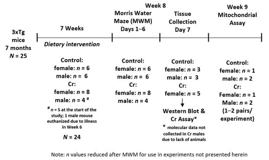 Experiments were conducted in male and female 3xTg mice, as described in detail elsewhere []. Mice were randomly assigned to either a control or Cr-supplemented diet at 7 months of age and kept on the diet for 8 weeks ± 7 days based on the experimental endpoint. Cr monohydrate (3%, w/w, Alfa Aesar, Ward Hill, MA, USA) was mixed with a semi-synthetic nutritionally complete diet, as described elsewhere []. Food and water were provided ad libitum. Weight was measured weekly, whereas food intake was measured twice weekly after subtracting the amount of food remaining from the food provided. Testing in the MWM began at week 8, followed by mitochondrial experiments at week 9. During week 6 of supplementation, one male Cr-fed mouse developed a prolapsed penis that was not responsive to treatment and was euthanized. All data from this mouse were excluded from any analysis. The resultant sample sizes from N = 24 mice for behavioral tests were: control: n = 6 males and n = 6 females; Cr-supplemented diet: n = 5 males and n = 8 females.