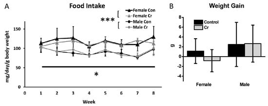 Food intake and weight gain as a function of diet in 3xTg mice. (A) Plot depicting food intake in adult (7-month-old) 3xTg control mice and 3xTg mice supplemented with Cr. Food intake (mg) was measured twice/week over the 8-week dietary intervention, averaged across the week, and expressed as mg/day. The mg/day value was divided by the animal’s body weight (g) to account for variations in food intake based on body weight. (B) Weight gain (ratio of g gained relative to initial body weight) over the 8-week study. Data were analyzed by two-way ANOVA. Mean ± SD depicted. Female control: n = 6; female Cr: n = 8; male control: n = 6; male Cr: n = 4; * p < 0.05; *** p < 0.001.