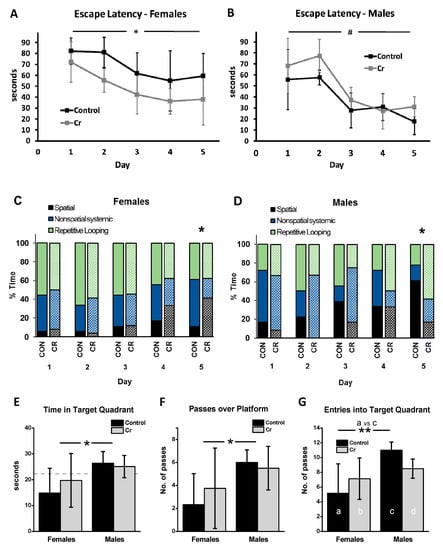 MWM (Morris water maze) as a function of diet in 3xTg mice. (A–D) Acquisition phase parameters as a function of diet in 3xTg mice. (A) In female mice, Cr supplementation significantly decreased escape latency (time to locate the platform; mean ± SD) overall across training days, indicating enhanced spatial earning; two-way ANOVA. (B) In males, however, Cr supplementation did not enhance performance in the MWM during training, as measured by escape latency, with a trend towards significantly greater escape latencies in supplemented males. (C,D) The frequency of use (% of total) of various search strategies (operationally defined as per []) was calculated across training days for control (solid bars) and Cr-supplemented (hatched bars) 3xTg mice and analyzed using Chi-square tests. (C) In females, reliance on spatial strategies increased with training in Cr-supplemented females, with the frequency of use peaking by the end of training, an effect that was not seen in control-fed 3xTg females. (D) In males, however, a reverse pattern was noted, where Cr supplementation resulted in a decreased reliance on spatial strategies relative to those on the control diet. (E–G). Memory retention in the MWM. On the last (6th) day of training, the platform was removed and mice were allowed 90 s to swim. Memory retention (mean ± SD) was evaluated in control-fed and Cr-fed mice by measuring (E) time in the target quadrant, (F) passes over the platform area, and (G) entries into the target quadrant. Female mice, regardless of diet, spent less time in the target quadrant (at levels below chance; indicated by dotted line in E) and made fewer passes over the platform (F) area than male 3xTg mice, confirming sex differences in spatial memory in this model. (G) Cr supplementation did not alter the number of entries in the target quadrant in either males or females. Sex differences in the number of entries in the target quadrant were only evident in control-fed 3xTg mice. Two-way ANOVA or MW: female control: n = 6; female Cr: n = 8; male control: n = 6; male Cr: n = 4; * p < 0.05; ** p < 0.01; # p < 0.1.