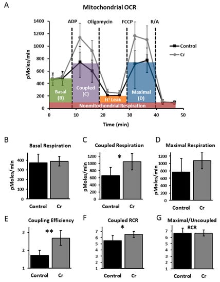 Oxygen consumption rates (OCR) in mitochondria isolated from the hippocampus in control and Cr-supplemented 3xTg mice. (A) Representative kinetics graph indicating real-time OCR at baseline and after addition of substrates adenosine diphosphate (ADP), oligomycin, carbonyl cyanide p-trifluoromethoxy-phenylhydrazone (FCCP), and rotenone-antimycin (R/A) in 10 μg of mitochondrial protein/well. (B) Basal respiration, (C) coupled respiration, and (D) maximal respiration (mean ± SD) were calculated after subtracting non-mitochondrial respiration (after R/A) and compared between control and Cr-supplemented mice. (E) Coupling efficiency was calculated by dividing coupled respiration (after addition of ADP) by basal respiration. (F) Coupled respiratory control ratio (RCR) was calculated by dividing coupled respiration rates (after ADP) by OCR after oligomycin. (G) Maximal or uncoupled RCR was calculated by dividing maximal respiration rates (after FCCP) by OCR after oligomycin. Cr supplementation selectively increased coupling-associated parameters in isolated mitochondria from both female and male 3xTg mice. Student’s t-test or Mann-Whitney U (MWU); n = 5 wells/group; * p < 0.05; ** p < 0.01.