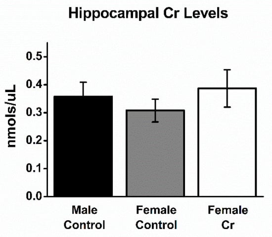 Levels of Cr in the hippocampus after 8 weeks of dietary intervention. Levels of Cr were measured in the hippocampi of Cr-supplemented female and control-fed male and female mice from tissue homogenates using a colorimetric kit (BioVision Inc.). ANOVA: female control: n = 3; female Cr: n = 5; male control: n = 3; p > 0.05.