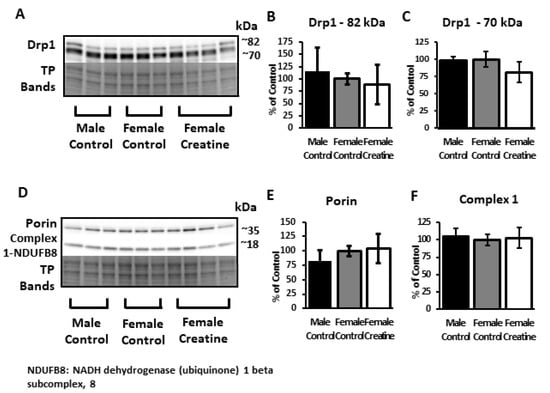 Several mitochondrial-associated proteins were probed in an attempt to elucidate putative molecular underpinnings for the noted enhanced OCR with Cr supplementation in isolated mitochondria from both sexes. Western blots using anti-Drp1, a key regulator of mitochondrial fission [], revealed two bands at ~72 and ~80 kDa, which were not significantly different between diets or sex (ANOVA; ~72 kDa: F(2, 7) = 0.4, p = 0.7; ~80 kDa: F(2, 8) = 2.78, p = 0.13). Similarly, no significant differences were detected in either porin (VDAC1) ((F(2, 7) = 0.18, p = 0.8), a constituent pore-forming protein of the outer mitochondrial membrane that permits subcellular ATP diffusion, or NDUFB8 complex I subunit of the ETC (F(2, 7) = 0.26, p = 0.8) (Figure 9). Although the Seahorse assay measures complex-I-dependent respiration, the antibody used to measure the complex I subunit also detects bands for subunits of complexes II–V. Analysis of densitometry values found no significant differences in levels of subunits to detect complexes II–V (p > 0.05 for all complexes; ANOVA, KW, and BF; see Supplementary Figure S1 for Western blot membranes).