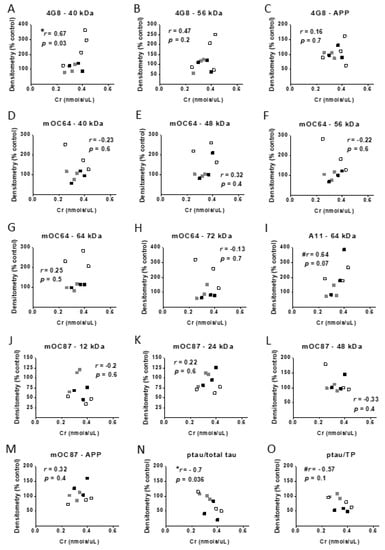Correlation coefficients were also calculated between hippocampal Cr levels and densitometry values that were semi-quantified for Aβ and tau (ptau and total tau) to further investigate relationships between brain Cr levels and molecular hallmarks of AD pathology. Levels of Aβ detected by 4G8 at 40 kDa were significantly positively correlated with hippocampal Cr (r = 0.67, p = 0.03). Densitometry values of the 64-kDa band using the A11 antibody were marginally significantly correlated with Cr levels (r = 0.64, p = 0.07). In contrast to the positive significant correlation with Aβ, Cr levels were significantly negatively correlated with ptau normalized to total tau (r = 0.7, p < 0.05) and marginally significantly correlated with ptau normalized to total protein (r = −0.57, p = 0.1) (see Figure 13). A moderate correlation between total tau and Cr levels was found, which did not reach statistical significance (p = 0.1). Overall, such data further implicate brain Cr as a mediating factor in the expression of AD-relevant biomolecules.