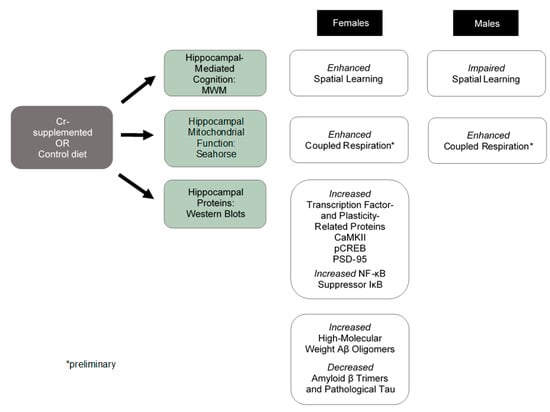 The present study reports on the effects of dietary Cr supplementation on multiple parameters in the 3xTg mouse model of AD, including spatial learning and memory, mitochondrial function, as well as levels of transcription factors and proteins implicated in learning, memory, and mitochondrial activity. Importantly, sex differences were noted in the effects of Cr supplementation on spatial cognition that could not likely be accounted for by corresponding sex differences in the effects of Cr supplementation on mitochondrial respiration, for which enhancements were seen in isolated hippocampal mitochondria from both sexes in preliminary experiments (see Figure 14 for a summary of findings).
