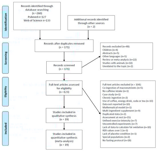 A total of 260 articles were initially obtained in the search and two additional articles were identified by examining the references from relevant articles. After duplicate removal, 171 studies were screened. By reading the title and abstracts, 48 articles were subsequently excluded because they included children as study participants, were not full articles, were not written in English or Spanish, were reviews or meta-analyses, involved animals as study samples, or were completely unrelated to the topic of this review. A total of 123 full-text articles were assessed for eligibility and 104 interventions were excluded for different reasons, including: the co-ingestion of caffeine with fat or carbohydrate; lack of acute caffeine ingestion, a case report; the use of coffee, energy drink, cola, or tea as sources of acute caffeine intake; missing data, the use of a multi-ingredient supplements, duplicated data; assessments not conducted during exercise; unfixed intensity workload; altered experimental conditions; lack of fat oxidation measure; RER values over 1; absence of a placebo condition; the involvement of special populations; and fasting period before the exercise intervention not reported or lower than 5 h, among others. After the selection procedure, 19 studies published between 1978 and 2020 were included in the qualitative and quantitative analysis (Figure 1).