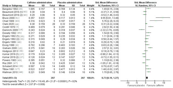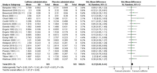 The scores for the PEDro scale are reported in Table 1. The mean score for the 19 articles was 8.5 ± 0.9 points, with a range of 6 to 10 points out of a maximal score of 10 points. All of the articles included in the meta-analysis positively fulfilled the statistic criteria (items 10 and 11). Details of the eligibility criteria of participants were only provided by four articles [,,,] (item 1). The inclusion of only crossover designs in the search strategy implied the administration of caffeine and placebo for the same group or groups of individuals, and in most cases the allocation was performed by randomizing the treatment order (item 2) [,,,,,,,,,,,,,,,,,]. Regarding the blinding process, as assessed by items 5, 6, and 7, most studies used a double-blind design [,,,,,,,,,,,,,,,], blinding the participants and the therapists. However, only one study included a blinding procedure for the evaluators []. In general, the quality of the investigations included in the meta-analysis can be evaluated as high.