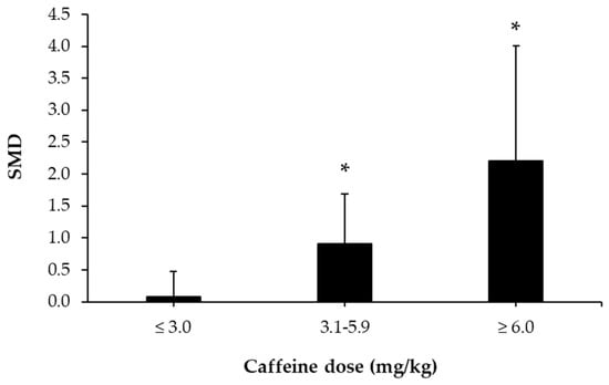 Dose–response effect of caffeine ingestion as compared to a placebo on fat oxidation rate during exercise. SMD values are the standardized mean difference values obtained with a meta-analysis of 19 studies and the bar represents 95% confidence intervals for the SMD for each dosage. (*) The effect of caffeine at this dosage was statistically significant, with a higher fat oxidation rate observed compared to placebo ingestion (p < 0.05).