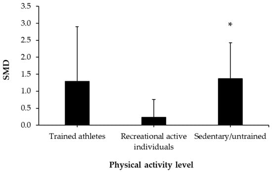 Effect of caffeine ingestion as compared to a placebo on the fat oxidation rate during exercise, depending on the physical activity level of the individuals. SMD values represent the standardized mean differences obtained with a meta-analysis of 19 studies and the bar represents 95% confidence intervals for the SMD in group of participants. (*) The effect of caffeine in this group was statistically significant, with a higher fat oxidation rate observed compared to placebo ingestion (p < 0.05).