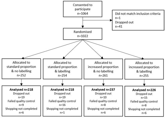 A total of 1064 participants consented to participate. Data from 899 (84.5%) who completed the study were analysed (Figure 2). Participants’ characteristics are presented in Table 1. Participants bought on average 10.9 ± 4.8 items (with a 5% quantile of 9 and a 95% quantile of 15). A total of 720 participants bought exactly 10 items and, among them, 473 participants bought all the 10 items from the shopping list (based on the section of the online supermarket items were selected from). The number of participants who bought at least one item by shopping list category is shown in Supplementary File 3.
