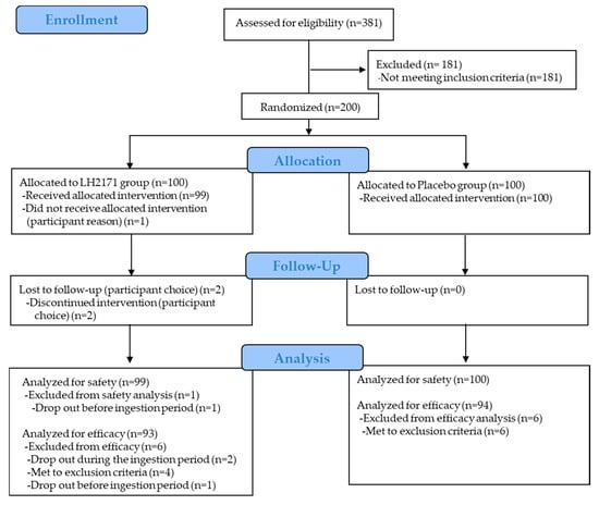 The full analysis set population, defined as all randomly assigned subjects who consumed test food more than once during the trial period, was used for safety analysis. The per-protocol set, which was defined as subjects not matching the inclusion criteria in the full analysis set population, was used for efficiency analysis.