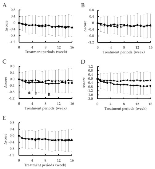 Stratified analyses were performed to assess the effects of the interventions on the pre-intake mental states, using POMS2 (Table S4). Table 7 shows the stratified JRQLQ scores with a low score for “friendliness”, showing a median of less than 51 at the 0-week time-point.