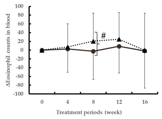 Changes in the eosinophil counts in the blood. Data are shown as the mean ± SD. Data were analyzed using the unpaired t-test. # p < 0.05 denotes statistically significant differences between groups. ●; LH2171 group, ▲; placebo group.