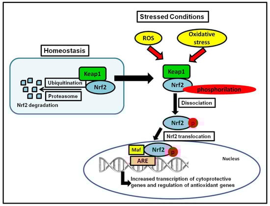 Nrf2 controls the redox homeostatic gene regulatory system, and the Nrf2 Kelch-like ECH-associated protein 1 (Keap1) complex is known as one of the most important mechanism in the cellular defense against oxidative stress [,]. Nrf2 regulates approximately 600 cytoprotective genes [], serving as a critical nuclear transcriptional inducer by binding to the antioxidant response element (ARE) in DNA promoters and controlling the transcription of many antioxidant genes such as glutathione reductase, thioredoxin, and glutathione-S transferase [,]. To maintain homeostasis as a sensor of oxidative stress, Keap1 serves as the main inhibitor of Nrf2, and regularly targets Nrf2 for ubiquitination and subsequent degradation of 26S proteasomal to keep Nrf2 basal levels []. During unstressed conditions, Nrf2 is kept in the cytoplasm bound to Keap1 in a relatively rapid interaction; with a short half-life of 13–21 min, this rapid turnover ensures low, basal levels of Nrf2 [,,,]. During stressed conditions (i.e., oxidative or endoplasmic reticulum (ER) stress), Nrf2 separates from Keap1, it is phosphorylated, translocated into the nucleus, and it stimulates the transcription of antioxidant genes controlled by ARE, ultimately initiating the detoxification of ROS by the regulation of glutathione levels [] (Figure 1).