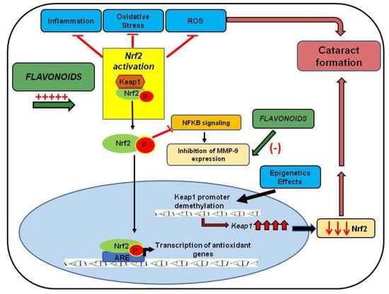 Cataracts account for over half of global blindness. Cataracts formations occur mainly due to aging and to the direct insults of oxidative stress and inflammation to the eye lens. The nuclear factor-erythroid-2-related factor 2 (Nrf2), a transcriptional factor for cell cytoprotection, is known as the master regulator of redox homeostasis. Nrf2 regulates nearly 600 genes involved in cellular protection against contributing factors of oxidative stress, including aging, disease, and inflammation. Nrf2 was reported to disrupt the oxidative stress that activates Nuclear factor-κB (NFκB) and proinflammatory cytokines. One of these cytokines is matrix metalloproteinase 9 (MMP-9), which participates in the decomposition of lens epithelial cells (LECs) extracellular matrix and has been correlated with cataract development. Thus, during inflammatory processes, MMP production may be attenuated by the Nrf2 pathway or by the Nrf2 inhibition of NFκB pathway activation. Moreover, plant-based polyphenols have garnered attention due to their presumed safety and efficacy, nutritional, and antioxidant effects. Polyphenol compounds can activate Nrf2 and inhibit MMP-9. Therefore, this review focuses on discussing Nrf2’s role in oxidative stress and cataract formation, epigenetic effect in Nrf2 activity, and the association between Nrf2 and MMP-9 in cataract development. Moreover, we describe the protective role of flavonoids in cataract formation, targeting Nrf2 activation and MMP-9 synthesis inhibition as potential molecular targets in preventing cataracts.