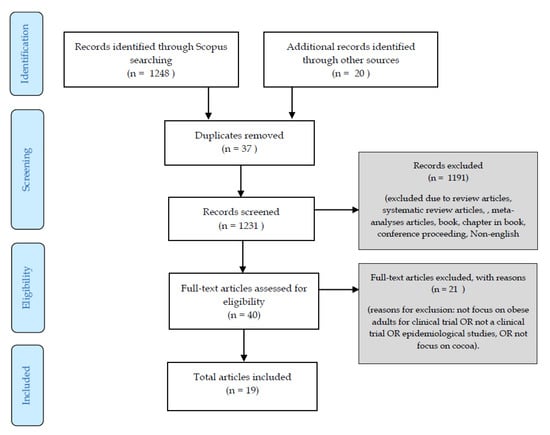 Articles from 2008 through 2019 on studies related to cocoa polyphenols and their effects on obesity were searched. Articles were retrieved based on keywords using multiple electronic databases (PubMed, Scopus, and ScienceDirect). The medical subject heading (MeSH) terms “cocoa” OR “cocoa polyphenol” OR “cocoa flavanol” OR “dark chocolate” AND “obese” OR “obesity” OR “body mass index” OR “Body Mass Index (BMI)” OR “body fat” OR “body fat” were utilized, and articles published in English from 2008 to 2019 were included. Study designs included in this scoping review include randomized controlled trials and observational studies that specifically looked into the effects of cocoa/dark chocolate on obese/overweight adults. Studies that did not meet the selection criteria or were not related to the research questions and duplicate publications were excluded. Further, several references that were obtained in full text were examined for additional material.