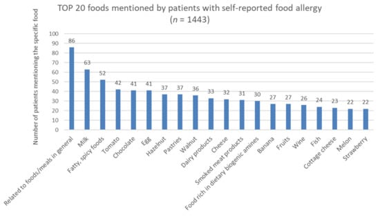 Several foods and food groups were mentioned by patients to have caused an allergic reaction. Patients were allowed to list as many foods as they wished. Altogether, 1443 food records were analyzed. The most common culprit foods are shown in Figure 1. One food record was categorized into one main food group. The culinary classification was used when categorizing foods (e.g., tomato as a vegetable, not a fruit).