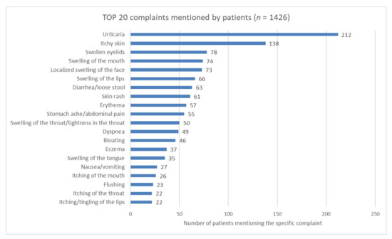 The most commonly reported complaints were urticaria (212/501, 42%) and generalized pruritus (138/501, 28%), followed by swollen eyelids (78/501, 16%), swelling of the mouth (15%) and lips (13%), and diarrhea/loose stool (13%) (Figure 2).