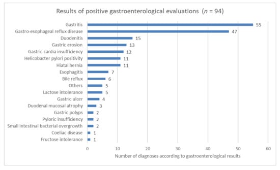 Based on the listed complaints, possible diagnoses aside from food allergy emerged, so additional referrals and examinations were initiated (n = 1230) (Table 5). A gastroenterological examination was the most frequently required (320/501, 64%). Of the 320 referrals to the gastroenterologist, 113 results were returned (gastroenterological abnormalities were found in 94 cases; 19 patients returned negative results). The results of positive gastroenterological examinations initiated for food-related complaints show that gastritis and gastroesophageal reflux disease were the most commonly diagnosed diseases (Figure 3).