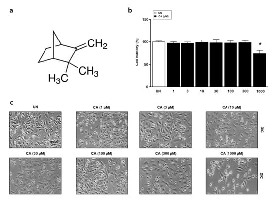 Effects of camphene (CA) on L6 skeletal muscle cells. (a) Chemical structure of CA; (b) L6 skeletal muscle cells were treated with CA (1, 3, 10, 30, 100, 300, and 1000 μM) and viability was measured by 2,3-bis-(2-methoxy-4-nitro-5-sulfophenyl)-2H-tetrazolium-5-carboxanilide (XTT) assay. The data are expressed as mean percentages relative to the untreated group ± standard deviations. * p < 0.05 vs. untreated group; (c) L6 cell morphology was examined by light microscopy.