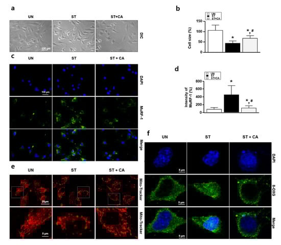 Effects of camphene on serum-starved L6 skeletal muscle cells. L6 skeletal muscle cells were cultured in Dulbecco’s modified Eagle’s medium (DMEM) supplemented with horse serum (1%) and treated with and without camphene (300 μM) for 3 d. UN: untreated group; ST: starvation group; ST + CA: starvation plus camphene group. (a) Observation of cell morphology by light microscopy; (b) the bar graph represents the relative cell size compared with the UN; (c) muscle RING-finger-1 (MuRF-1) expression (green color) was determined by immunocytochemistry; (d) the bar graph represents the relative intensity of MuRF-1; (e) immunocytochemistry assay with Mito TrackerTM Red FM (red color); (f) immunocytochemistry assay with anti-8-oxoguanine (8-OXG) antibody (green color). DAPI, 4′-6-diamidino-2-phenylindole (blue color); data are (b,d) expressed as mean relative percentages compared with the UN ± standard deviations. * p < 0.05 vs. UN; # p < 0.05 vs. ST.