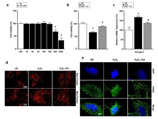 Effects of camphene (CA) on H2O2–induced atrophy of L6 skeletal muscle cells. L6 skeletal muscle cells were cultured in Dulbecco’s modified Eagle’s medium (DMEM) supplemented with horse serum (1%) and treated with H2O2 (500 μM) in the presence or absence of camphene (300 μM) for 24 h. UN: untreated group; H2O2: the group is treated with H2O2; H2O2 + CA: the group is treated with camphene and H2O2. (a) Effects of various H2O2 concentrations on L6 cell viability; (b) L6 cell viability in the UN, H2O2, and H2O2 + CA samples; (c) expression of atrogin-1 mRNA, expression levels were normalized to β-actin; (d) immunocytochemistry assay with Mito TrackerTM Red FM (red color); (e) immunocytochemistry assay with 8-OXG antibody (green color). DAPI, 4′,6-diamidino-2-phenylindole; expression of lipid and carbohydrate metabolism genes in the UN, H2O2, and H2O2 + CA samples; all data are expressed as mean relative percentages compared with the UN ± standard deviations. * p < 0.05 vs. UN; # p < 0.05 vs. H2O2.