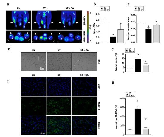 To investigate whether camphene can regulate starvation-induced muscle atrophy in vivo, we performed 18F-FDG PET/CT, Haemotoxylin and Eosin (H&E) staining and immunohistochemistry assay. With prolonged starvation, skeletal muscle cells display increased ROS-induced oxidative stress, and muscle size decreases [18]. Thus, we examined the protective effects of camphene against starvation-induced skeletal muscle atrophy. By 18F-FDG PET/CT, the mean SUVs of the UN, ST, and ST + CA were significantly different, at 1.78 ± 0.29, 0.56 ± 0.11, and 1.12 ± 0.46, respectively (p = 0.016). Post hoc analysis showed that the UN and ST + CA had significantly higher SUVs than the ST (p < 0.05). However, there was no difference in SUV between the UN and ST + CA (p > 0.05; Figure 4a,b). Next, to determine the protective effect of camphene starvation-induced skeletal muscle atrophy in rats, muscle mass measurements using CT with the index of muscle mass (IMM) were performed. IMM in the ST was significantly reduced compared with that of the UN, while the ST + CA was similar to that of the UN, as in Figure 4c. Hematoxylin and eosin staining was also performed to examine the histological change of muscle morphology. The stained specimens were obtained from muscle sections and then analyzed by counting the central nuclei of the muscles in the magnification fields. As shown in Figure 4d,e, the number of central nuclei in ST is greater than that in UN. In the ST + CA, the skeletal muscle cells’ central nuclei were significantly reduced compared with that of the ST. The presence of MuRF-1 indicates the prior degeneration and persistent atrophy of the muscle [24]. To confirm muscle atrophy, we performed an immunohistochemistry assay with MuRF-1 antibody. The expression of MuRF-1 in the ST significantly increased compared with that in the UN, while MuRF-1 expression in the ST + CA was similar in the UN and ST + CA, as in Figure 4f,g.