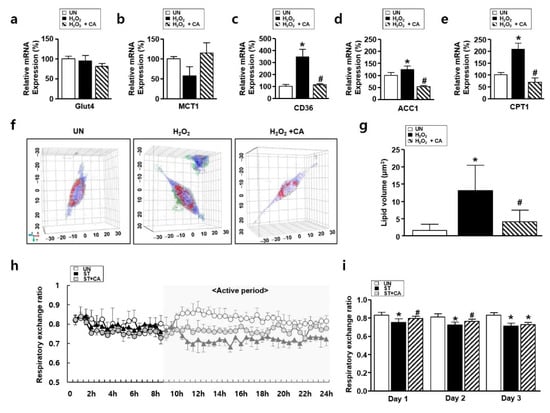 The effect of camphene on lipid metabolism in hydrogen peroxide (H2O2)-stimulated L6 skeletal muscle cells and starved rats. (a–e) Expression of carbohydrate and lipid metabolism genes in the UN, H2O2, and H2O2 + CA. Expression levels were normalized to β-actin. * p < 0.05 vs. UN; # p < 0.05 vs. H2O2; (f,g) tomographic images of L6 cells treated with H2O2 with and without camphene. Red indicates lipids; UN: untreated group; H2O2: the group is treated with H2O2 (500 μM) for 24 h; H2O2 + CA: the group is treated with camphene (300 μM) and H2O2 (500 μM) for 24 h. * p < 0.05 vs. UN; # p < 0.05 vs. H2O2; (h,i) respiratory exchange ratios of the UN, ST, and ST + CA over (h) 24 h and (i) change in mean respiratory exchange rate over 3 days (n = 8). UN: untreated group; ST: starved group; ST + CA: the group is starved and treated with camphene. * p < 0.05 vs. UN; # p < 0.05 vs. ST; all data are expressed as mean percentages relative to the UN ± standard deviations.