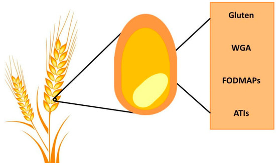 In addition to gluten, wheat contains other components that can have a strong impact on gut physiology, including wheat germ agglutinin (WGA), FODMAPs, and α-amylase/trypsin inhibitors (ATIs) (Figure 1).