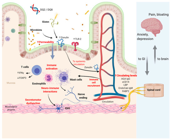 Wheat is one of the major food crops cultivated and consumed worldwide. The average gluten intake in Western diets is estimated in the range of 5–20 g/day. Gluten proteins are the most abundant proteins in the wheat kernel and are essential for the germination and the development of the seed [30]. Gluten proteins form a network in dough essential to ensure the cohesiveness of wheat required to make products such as bread and pasta. Gluten proteins are prolamins, rich in glutamine and proline, and they have different names, including (a) gliadins (monomers) and glutenins (polymers) in wheat, (b) hordeins in barley, and (c) secalins in rye [31]. The abundance of glutamine and proline in gliadin reduces the breakdown of gluten by proteases in the gastrointestinal tract, hence reducing digestibility. Gliadin has been shown to induce a transient increase in intestinal permeability in healthy subjects, which is directly related to the amount of ingested peptide [32,33]. Although the mechanism underlying this increase in epithelial permeability remains unclear, it has been suggested that a key event is the binding of gliadin to the C-X-C Motif Chemokine Receptor 3 (CXCR3) on epithelial cells. This binding induces an increase in intestinal permeability through a MyD88-dependent release of zonulin. Zonulin-dependent disengaging of tight junctions enables the passage of gliadin through the epithelial barrier into the mucosa [34], ultimately enhancing the passage of indigested peptides into the lamina propria followed by overstimulation of the immune system. Glutamine and proline are the substrates of mucosal tissue transglutaminases (tTGs). The peptides produced by tTGs have a great affinity for major histocompatibility complex II (MHC II), which strongly stimulates the immune system in human leukocyte antigen (HLA)-DQ2/8-positive subjects [35]. The prototype of gluten-related disorders is CD, in which the antigen presentation to T cells induces innate and adaptive responses that culminate in villus atrophy, crypt hyperplasia, and enhanced infiltration of intraepithelial lymphocytes [36,37]. A recent study confirmed the correlation between gluten consumption and the risk to develop CD in children [38]. Gut microbiota could play an important role in the pathophysiology of gluten-related disorders [39,40], principally because microbes can digest gluten, forming immunogenic peptides, which activate the immune system. The analysis of urine metabolites by nuclear magnetic resonance showed a characteristic profile in CD patients different from healthy subjects. Interestingly, the metabolites differentiating CD from controls were linked to the gut microbiota, and these differences were abolished after a GFD [41]. Initial evidence suggests that gluten can have an impact on the central nervous system, as well as mood and psychological aspects by changing gut microbiota. Meanwhile, neuritis, ataxia, and partial degeneration of the spinal cord in patients with CD have been known for decades and have been attributed to the central role of tissue transglutaminase-2 (tTG2), which would function as an autoantigen, thereby inducing the formation of tTG2 autoantibodies. The interaction between gluten and microbiota has been recently reported in a randomized double-blind placebo-controlled (DBPC) study which showed that the combination of a GFD and probiotic improved psychiatric symptoms, preventing inflammation and improving the gut barrier [42].