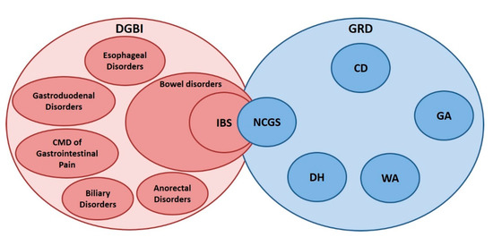 The overlap between IBS and NCGS. Disorders of gut–brain interaction (DGBI) include several disorders [95] affecting the gastrointestinal tract in which the gut–brain axis has a role in symptom generation. Among gluten-related disorders (GRD), NCGS is completely distinct from the other conditions including celiac disease (CD), gluten ataxia (GA), dermatitis herpetiform (DH), and wheat allergy (WA). NCGS is partially overlapped to IBS for symptoms, although there are also some differences. NCGS is characterized by a greater incidence, although not to the same extent as CD, of anemia, weight loss, low body mass index, atopy, osteopenia and osteoporosis compared to IBS. CMD of Gastrointestinal Pain: Centrally Mediated Disorders of Gastrointestinal Pain.