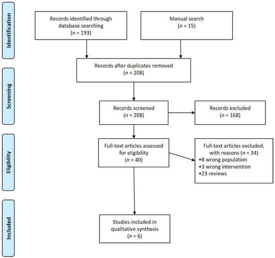A total of 208 records were identified in the search process (Figure 1). Of these, six were selected after review and assessed for eligibility. No relevant unpublished studies from rheumatology and nutrition congresses were obtained.