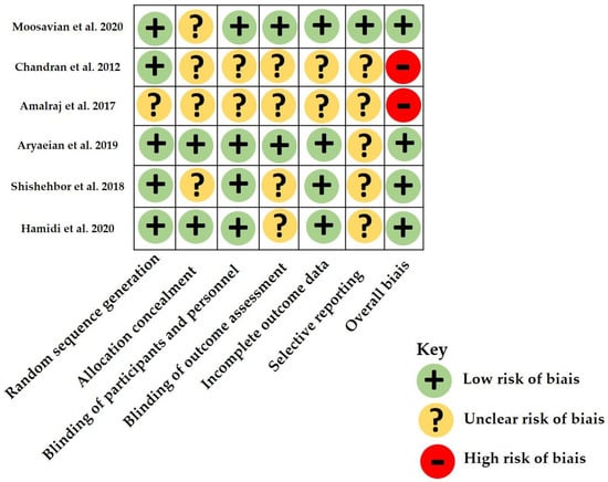 The risk of bias in all six studies according to the Jadad score of randomized controlled trials and Cochrane’s tool is reported in Table S1 (Supplementary Materials) and Figure 2, respectively. All selected studies but one were double-blind randomized controlled trials. Chandran’s and Amalraj’s studies were considered at high risk of bias. Four of the six studies had a Jadad score of 4 or more. Two studies did not report the used randomization sequence.